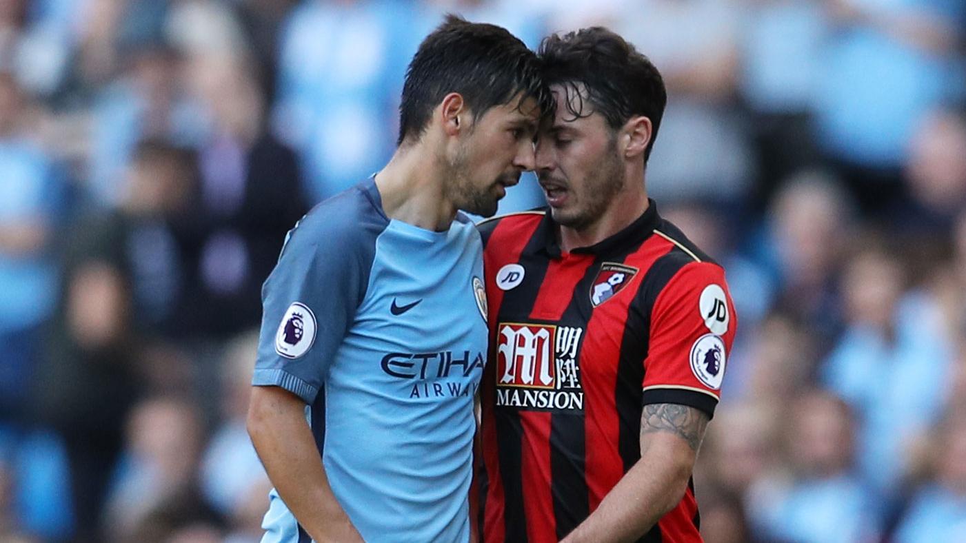 Nolito is shown a red card for going head-to-head with a Bournemouth player late in Manchester City's blowout win.