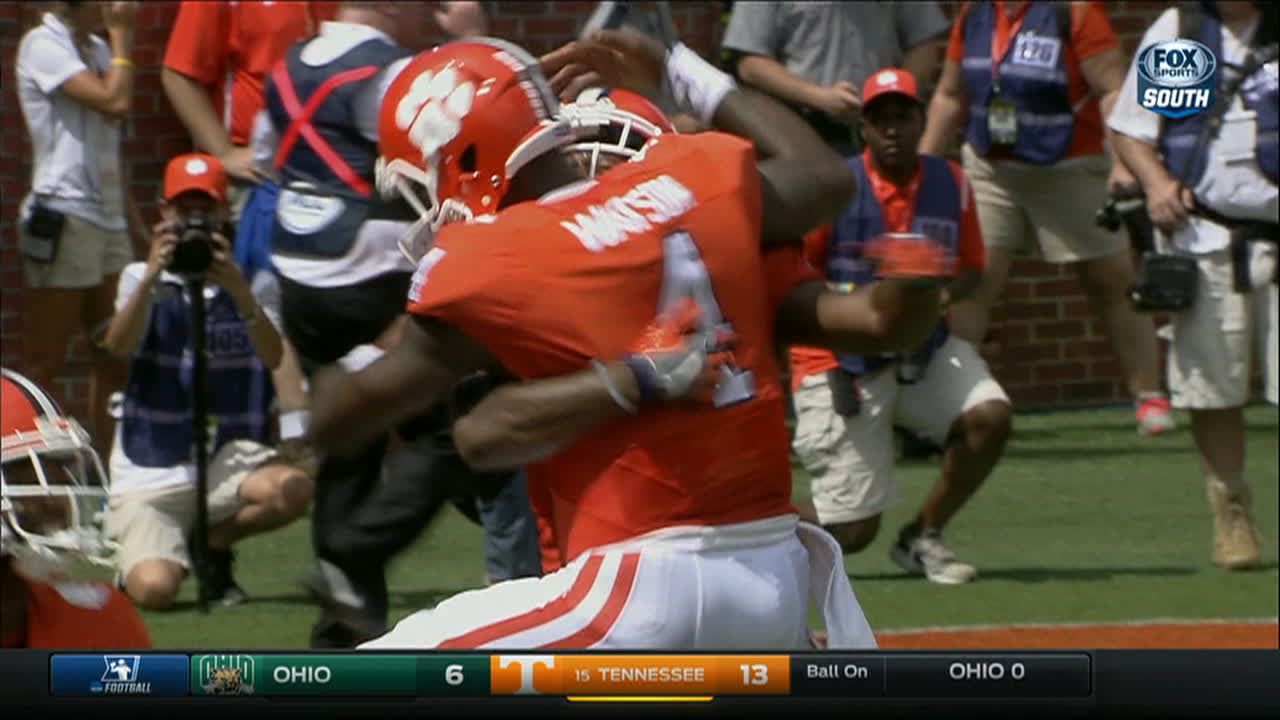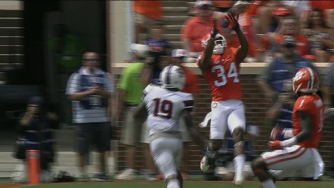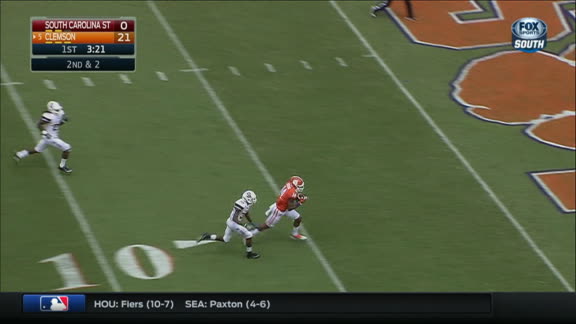 After a brief absence, QB Deshaun Watson comes back in the game for Clemson to throw this 36-yard TD pass to Ray-Ray McCloud. No. 5 Clemson leads South Carolina State 38-0.
