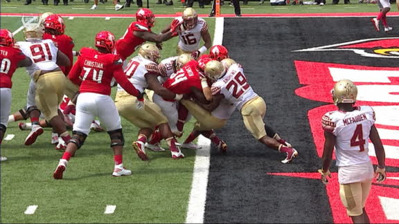 Louisville QB Lamar Jackson's 14-yard TD run is his second rushing score of the game. He's now accounted for 15 TDs on the season. No. 10 Louisville leads No. 2 FSU 14-0 on ABC.