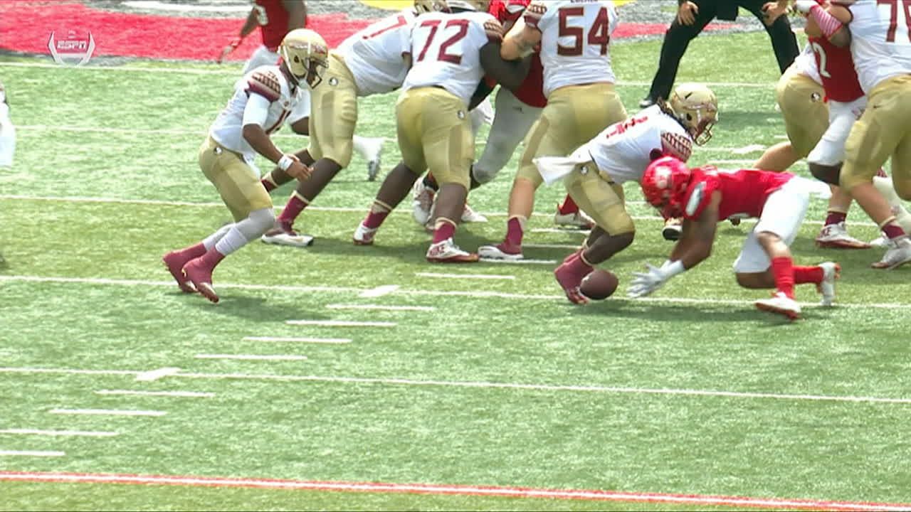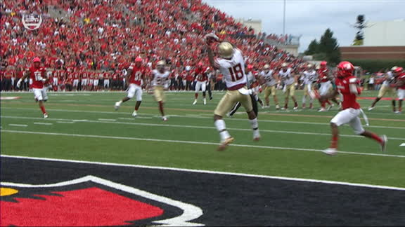 QB Lamar Jackson throws a short pass to Jaylen Smith, who picks up a big gain and helps set up an eventual Cardinals TD. No. 10 Louisville leads No. 2 FSU 7-0 early on ABC.