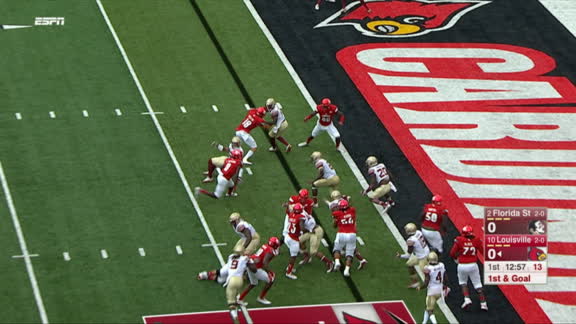 Lamar Jackson, who had been responsible for a Power-5 best 13 TDs entering Saturday's games, runs for the game's first touchdown. He just found the end zone again to give No. 10 Louisville a 14-0 lead over No. 2 FSU on ABC.