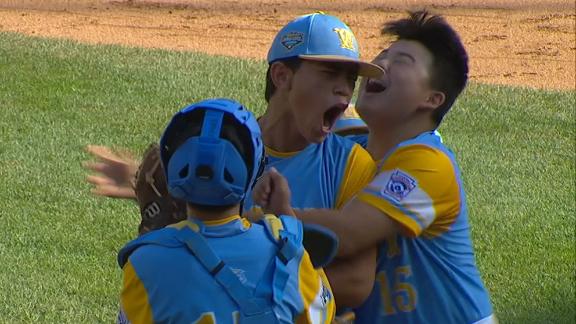 Hawai'I records the final out to win the 2018 Little League World Series with a 3-0 win over South Korea.