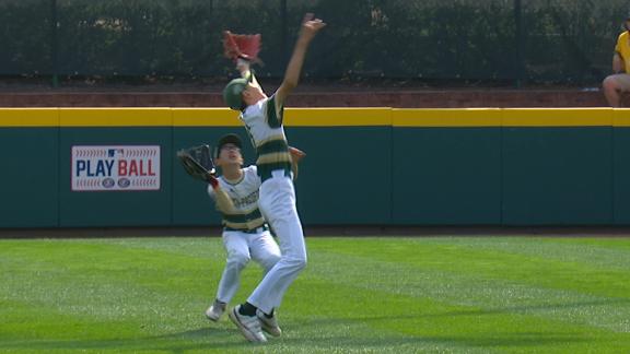 With the bases loaded, South Korea's Jun Woo Lim avoids colliding with his teammate to make a nice catch and keep the score at 1-0 for Hawai'i.