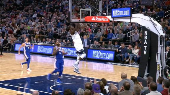 Karl-Anthony Towns grabs the rebound that starts the outlet transition to Gorgui Dieng and the slam.
