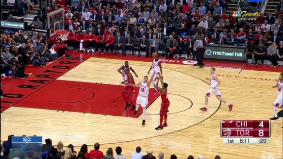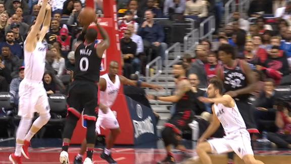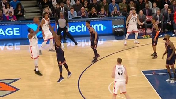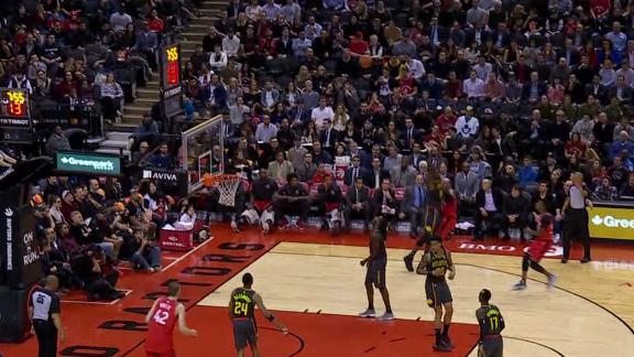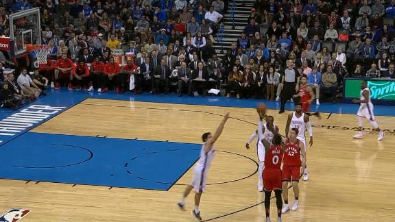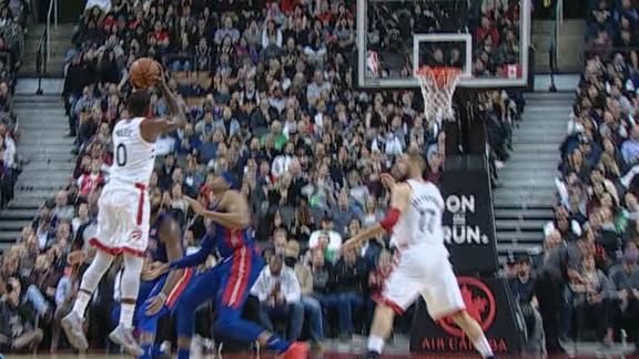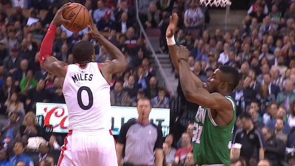 CJ Miles grabs the hand-off from Jonas Valanciunas and makes a crucial 3-pointer to give Toronto a seven-point cushion.