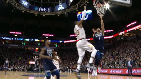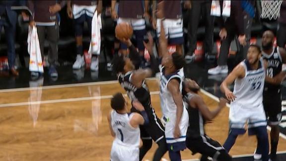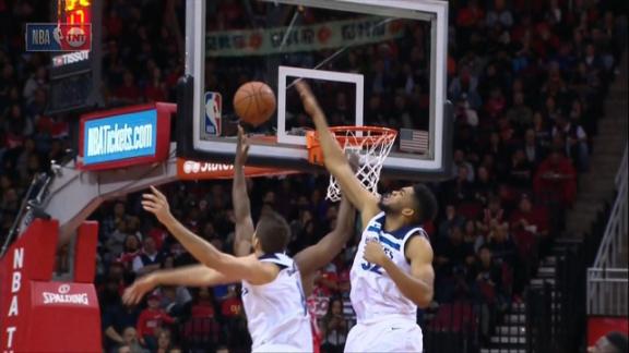 Karl-Anthony Towns blocks James Harden's layup attempt and Tyus Jones finishes on the other end.