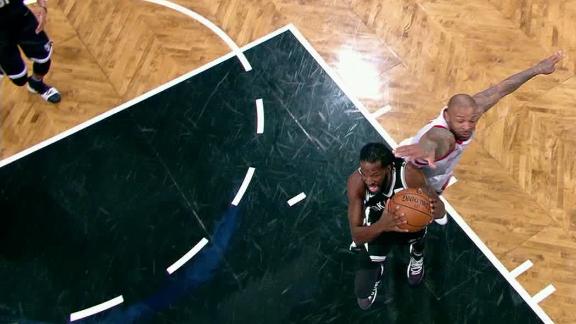 The Nets aren't able to secure the ball to give the Rockets possession, but DeMarre Carroll quickly swipes it back, rushes to the hoop and connects on the lay-in.
