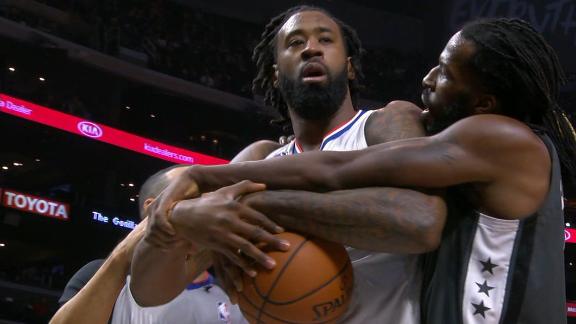 After getting wrapped up in a foul, DeAndre Jordan and DeMarre Carroll give each other a quick hug.