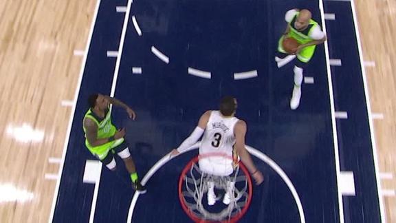 Karl-Anthony Towns passes the ball to Taj Gibson, who finds his way past Josh Hart and throws down a two-handed dunk.