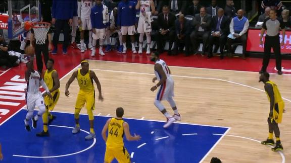 Reggie Jackson is forced from the game and needs to be helped off the floor after turning his right ankle on Myles Turner's shoe.