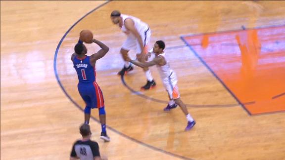 Reggie Jackson takes outlet pass all the way to the 3-point line and drains the shot.
