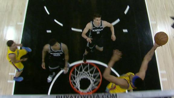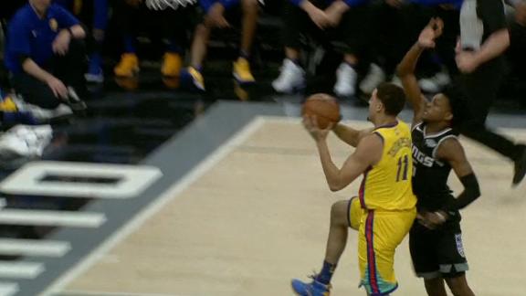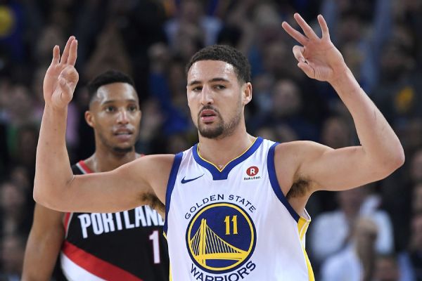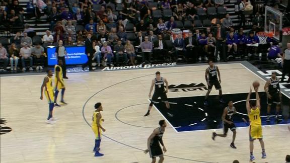 Klay Thompson makes a nice ball fake and gets a friendly roll to get the 3-pointer to drop.
