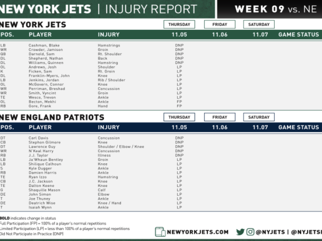 Jets injury report: Tomorrow is a critical day for Sam Darnold, who is expected to practice. They hope Jamison Crowder can practice, but we'll see. Blake Cashman becomes the second player with TWO hamstring injuries at the same time.