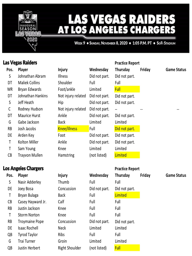 Trent Brown is not on the Raiders Injury Report today because he is no longer on the team's active roster; he was returned to the COVID-19 list on Thursday for the second time in two weeks. And while Bryan Edwards was a FULL participant in practice Thursday, Josh Jacobs and Johnathan Abram sat out with illness.