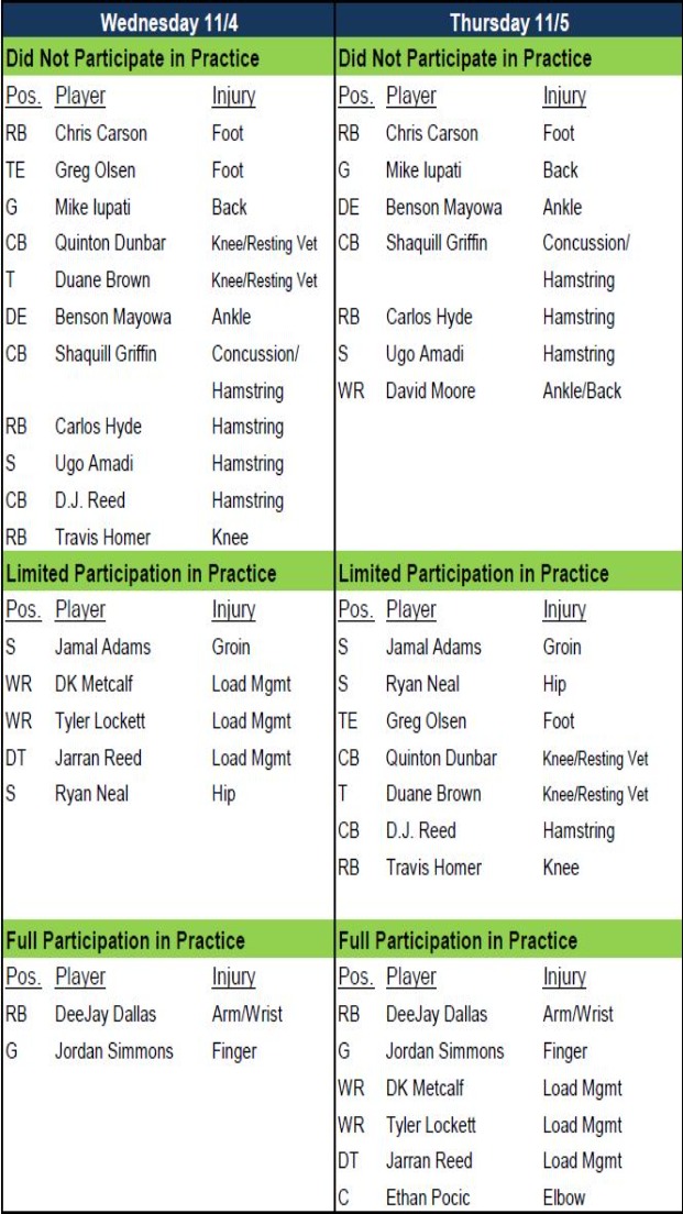 Chris Carson and Carlos Hyde didn't practice again Thursday while Travis Homer was limited. That aligns with Pete Carroll's earlier comments. He said Carson will test his sprained foot on Friday, Hyde is unlikely to return this week and Homer is likely to be available again Sunday at Buffalo. Also no practice again for Benson Mayowa, Shaquill Griffin or Ugo Amadi. Carroll was optimistic on Mayowa playing Sunday at Buffalo but not with Amadi. David Moore (DNP) wasn't on Wednesday's report.