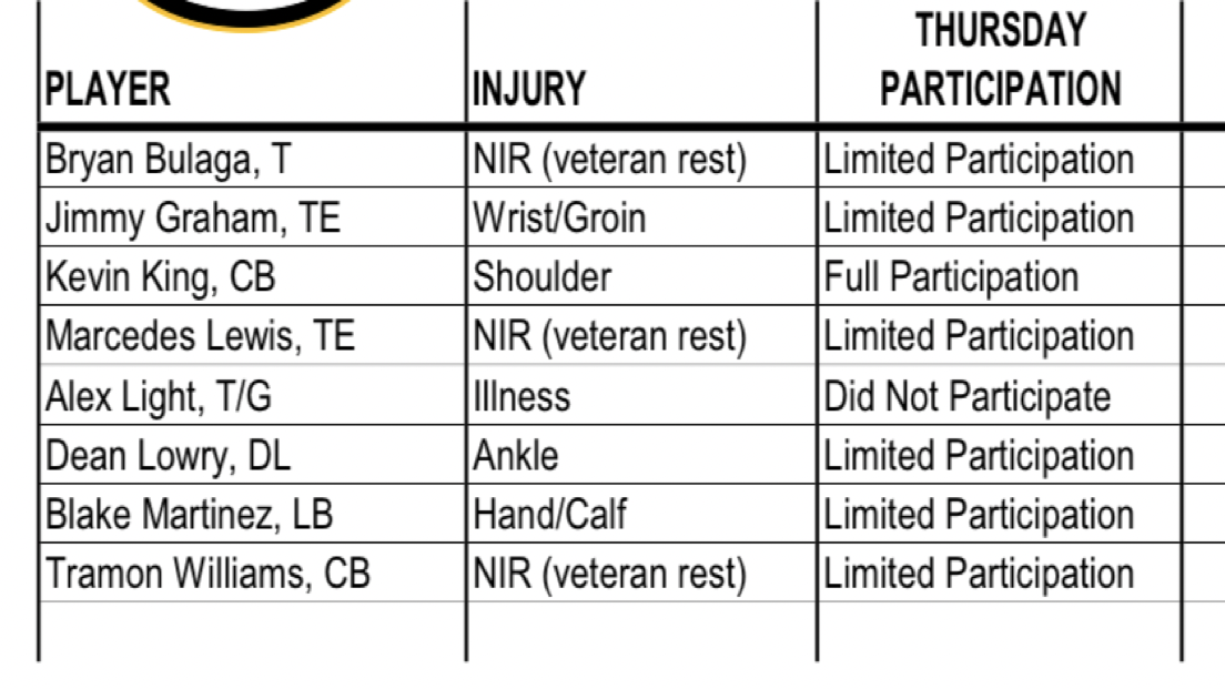 Jimmy Graham, Blake Martinez and Tramon Williams worked off to the side, while there was no sign of backup T Alex Light at Thursday's practice.