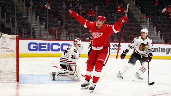 Jakub Vrana finishes a nice pass from Gustav Lindstrom in Detroit's 4-1 win over Chicago.